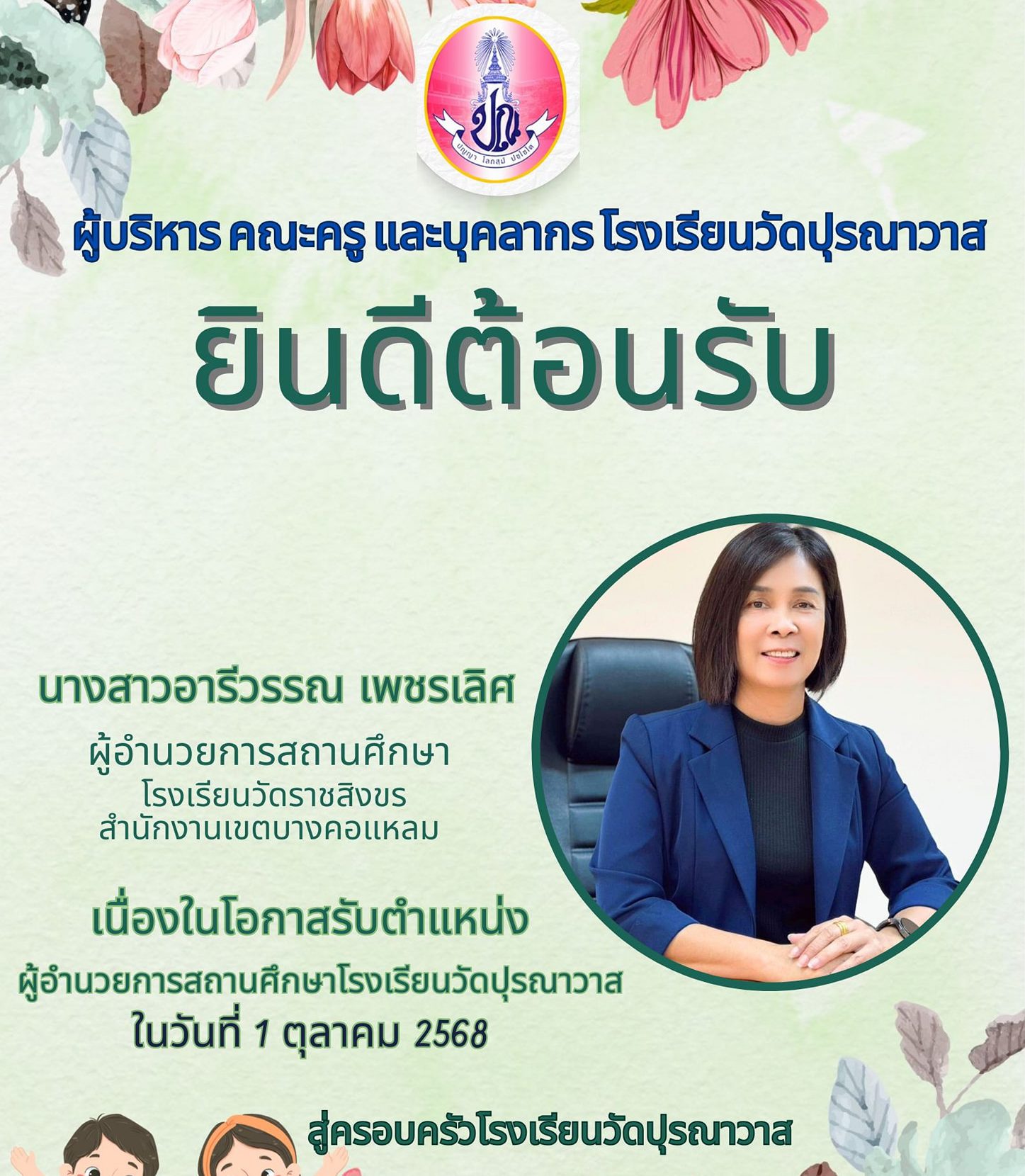Posted on 14/10/2025 ผู้ดูแลระบบ No Comments ประชาสัมพันธ์ 6 Views วันที่ 30 กันยายน 2568 โรงเรียนวัดปุรณาวาส ยินดีต้อนรับ นางสาวอารีวรรณ เพชรเลิศ ผู้อำนวยการสถานศึกษา โรงเรียนวัดราชสิงขร สำนักงานเขตบางคอแหลม เนื่องในโอกาสรรับตำแหน่งผู้อำนวยสถานศึกษาโรงเรียนวัดปุรณาวาส ในวันที่ 1 ตุลาคม 2568 ด้วยความยินดียิ่ง